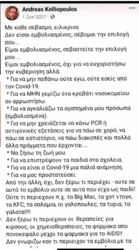 Αυτό που κάνει εντύπωση για ακόμη μία φορά είναι ότι ο δικηγόρος ήταν θιασώτης των εμβολιασμών κατά του Covid και μάλιστα έκανε «κηρύγματα» μέσω του Facebook για την αναγκαιότητα του εμβολιασμού ώστε να μπορεί να ζήσει προστατευμένος αυτός και τα αγαπημένα του πρόσωπα όπως τουλάχιστον είχε στο μυαλό του μέσω της εικόνας που του δημιούργησαν οι ειδικοί που παρουσιαζόταν καθημερινά σε εκπομπές της τηλεόρασης.