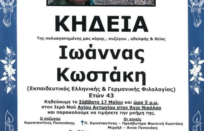 Θλίψη έχει σκορπίσει η είδηση του θανάτου της εκπαιδευτικού Ιωάννας Κωστάκη, που έφυγε από τη ζωή σε ηλικία μόλις 43 ετών.