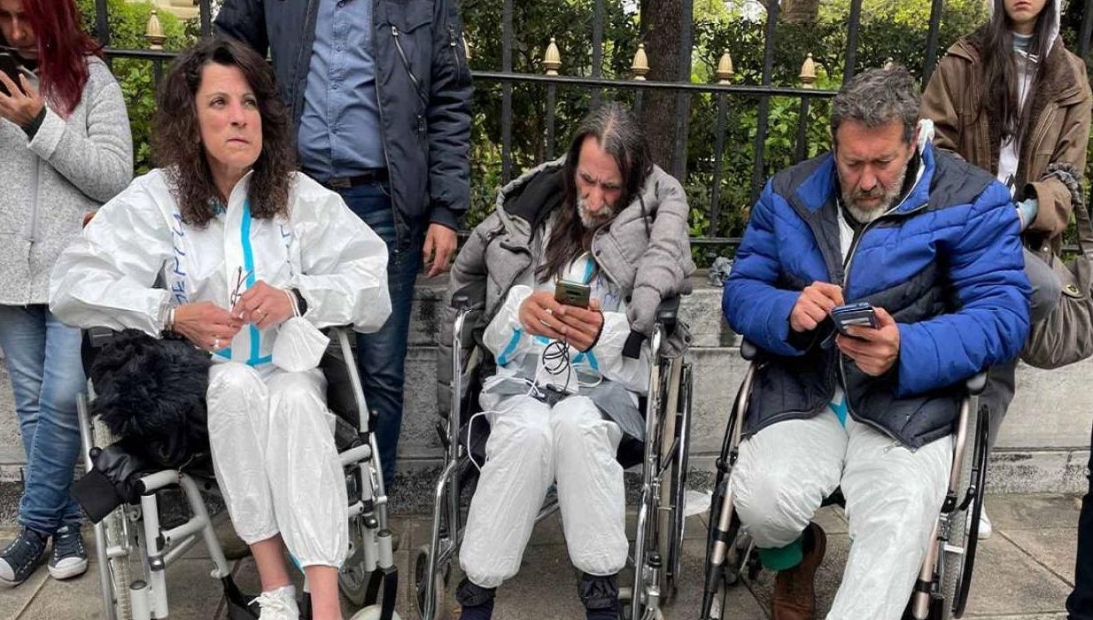 Έξω από το Μέγαρο Μαξίμου περίμεναν χθες, υπό βροχή, τον πρωθυπουργό Κυριάκο Μητσοτάκη τρεις απεργοί πείνας, πάνω σε αναπηρικά καροτσάκια.