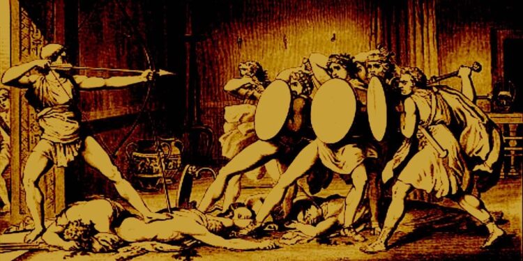 δεῖπνο μνηστήρων, ἓπονταν πίσω  νομεῖς δύο.