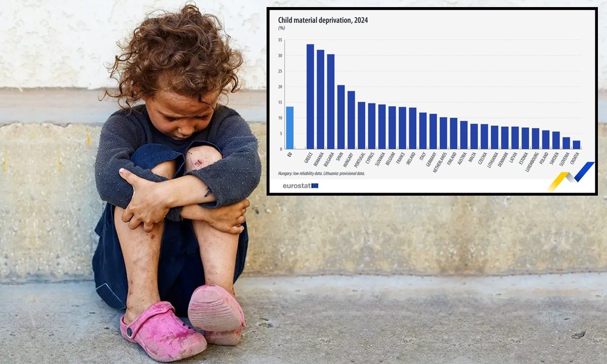 Τα στοιχεία – σοκ που δημοσίευσε η Eurostat για τη χώρα μας, αποτυπώνουν την καμένη κοινωνική γη που άφησε στο πέρασμά της η δεκαετία μνημονίων και η ακόλουθη εξαετία μητσοτακικής ερήμωσης. Η Ελλάδα το 2024 έφτασε να καταλαμβάνει την πρώτη θέση των χωρών της ΕΕ στην παιδική φτώχεια, με το 33,6% να ζει σε συνθήκες ένδειας και άρα το 1 στα 3 ελληνόπουλα να στερείται βασικά αγαθά και υπηρεσίες.