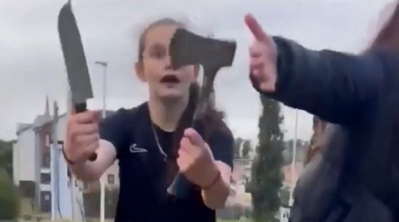 Η έφηβη στο βίντεο φαίνεται να βγάζει ένα κουζινομάχαιρο και ένα τσεκούρι και να ουρλιάζει στον άντρα να τις αφήσει ήσυχες. Προειδοποιεί, «Μην την αγγίζεις»!