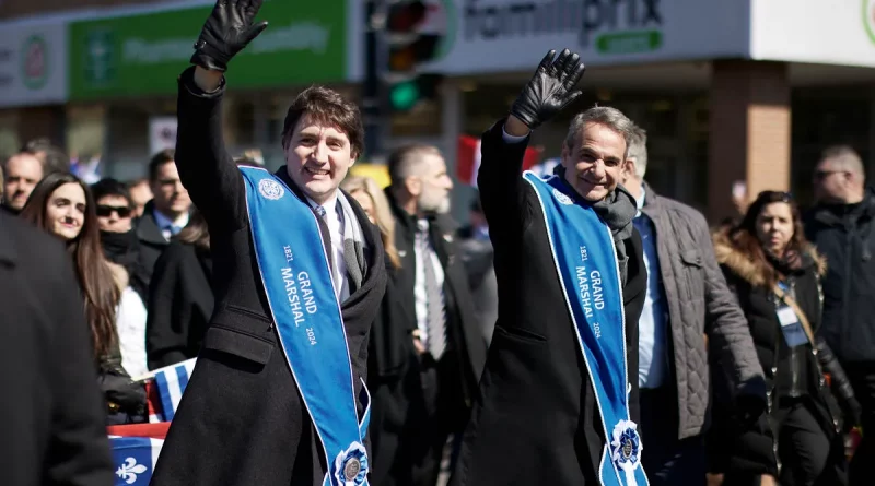 (Ξένη Δημοσίευση). Ο πρωθυπουργός Κυριάκος Μητσοτάκης, μαζί με τον Καναδό ομόλογό του, Τζάστιν Τριντό, χαιρετούν κόσμο, στην παρέλαση συλλόγων της Ελληνικής Κοινότητας Μείζονος Μόντρεαλ, για την επέτειο της 25ης Μαρτίου, στο Μόντρεαλ του Καναδά, Κυριακή 24 Μαρτίου 2024. Ο πρωθυπουργός πραγματοποιεί επίσημη επίσκεψη στον Καναδά. Δευτέρα 25 Μαρτίου 2024. ΑΠΕ-ΜΠΕ/ΓΡΑΦΕΙΟ ΤΥΠΟΥ ΠΡΩΘΥΠΟΥΡΓΟΥ/ΔΗΜΗΤΡΗΣ ΠΑΠΑΜΗΤΣΟΣ