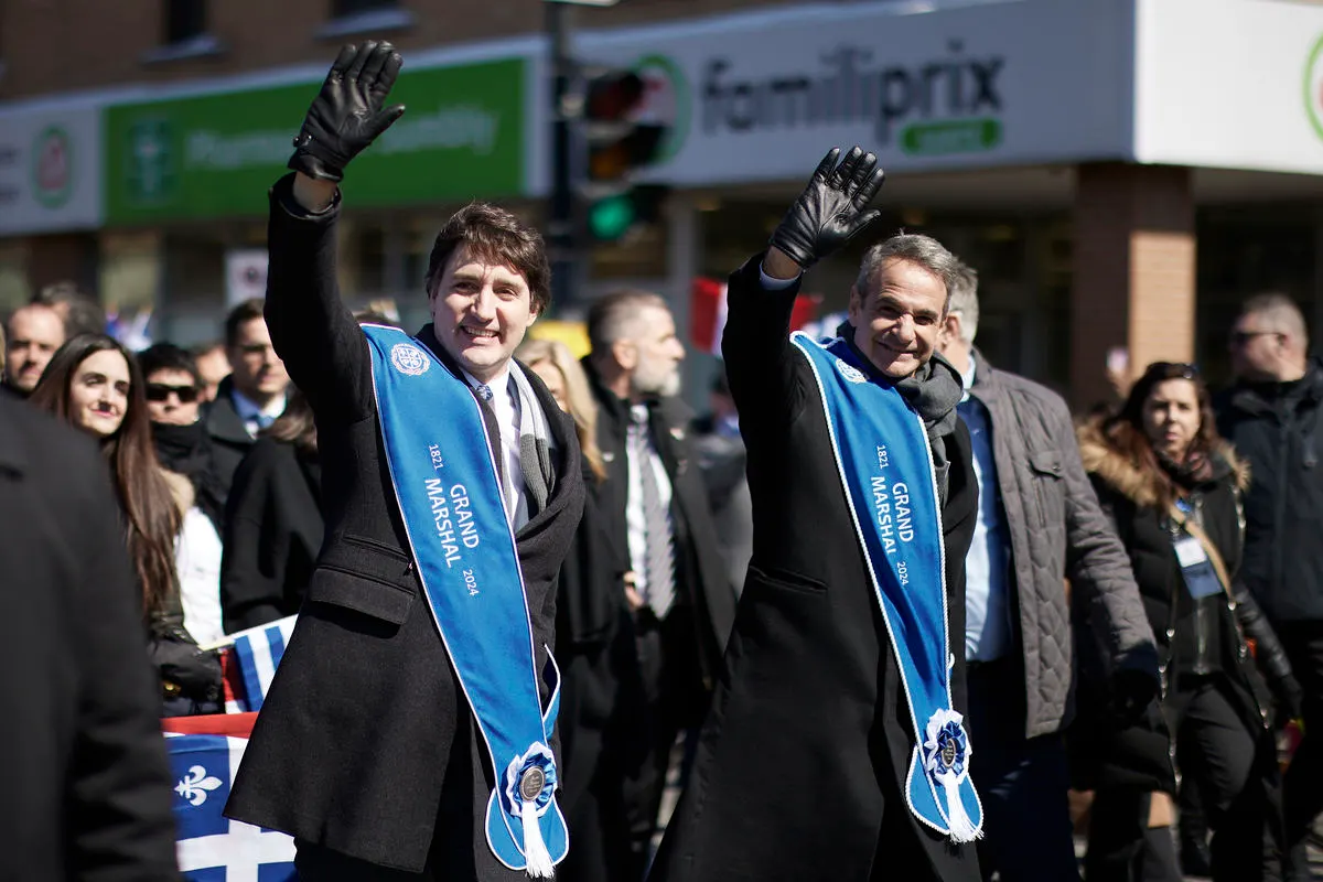 (Ξένη Δημοσίευση). Ο πρωθυπουργός Κυριάκος Μητσοτάκης, μαζί με τον Καναδό ομόλογό του, Τζάστιν Τριντό, χαιρετούν κόσμο, στην παρέλαση συλλόγων της Ελληνικής Κοινότητας Μείζονος Μόντρεαλ, για την επέτειο της 25ης Μαρτίου, στο Μόντρεαλ του Καναδά, Κυριακή 24 Μαρτίου 2024. Ο πρωθυπουργός πραγματοποιεί επίσημη επίσκεψη στον Καναδά. Δευτέρα 25 Μαρτίου 2024. ΑΠΕ-ΜΠΕ/ΓΡΑΦΕΙΟ ΤΥΠΟΥ ΠΡΩΘΥΠΟΥΡΓΟΥ/ΔΗΜΗΤΡΗΣ ΠΑΠΑΜΗΤΣΟΣ