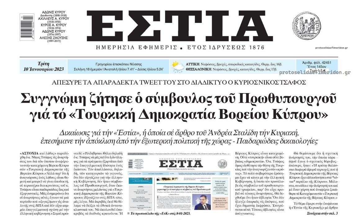 Κυριακή 8 Ιανουαρίου 2023. Άρθρο μου στο πρωτοσέλιδο της Εστίας έβγαζε «στη σέντρα» τον Νίκο Τσάφο, τότε σύμβουλο του πρωθυπουργού, επειδή χαρακτήριζε τα Κατεχόμενα «Τουρκική Δημοκρατία της Βορείου Κύπρου».